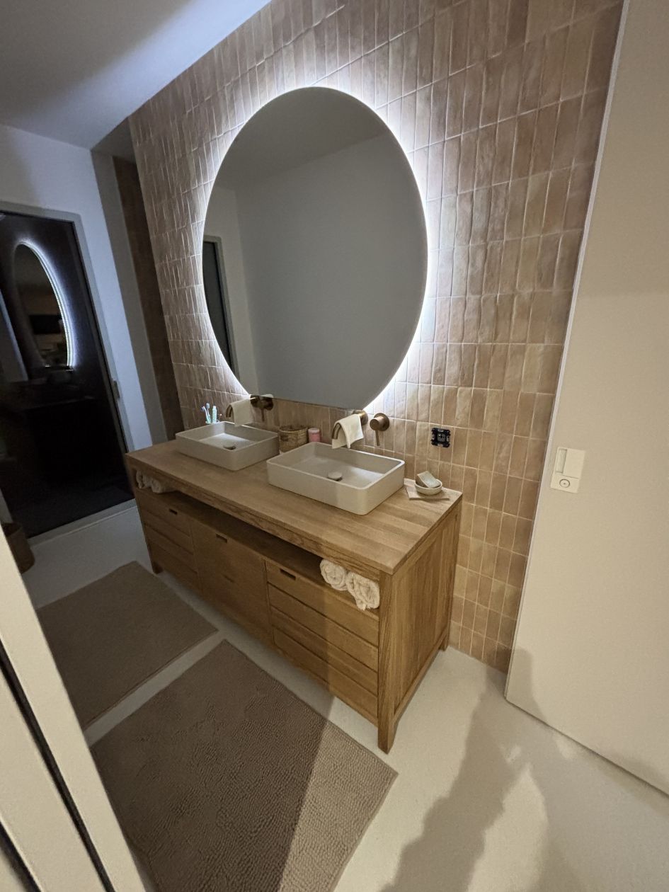 La maison dispose d'un système de gestion pratique pour le quotidien et de salles de bain équipées selon les choix esthétiques de Mr et Mme D.