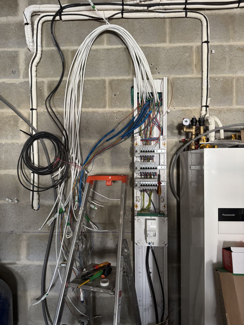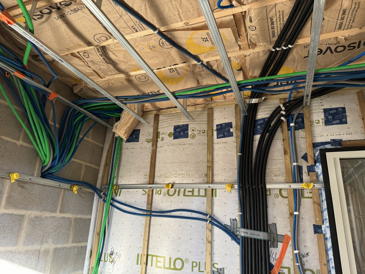 Pour cette construction neuve de 160 m² sur deux niveaux, Mr et Mme D. ont demandé la réalisation simultanée de toute l'installation : plomberie et électricité.La demande portait sur l'alimentation de trois salles de bain et trois WC, ainsi que le câblage complet de l'habitation.