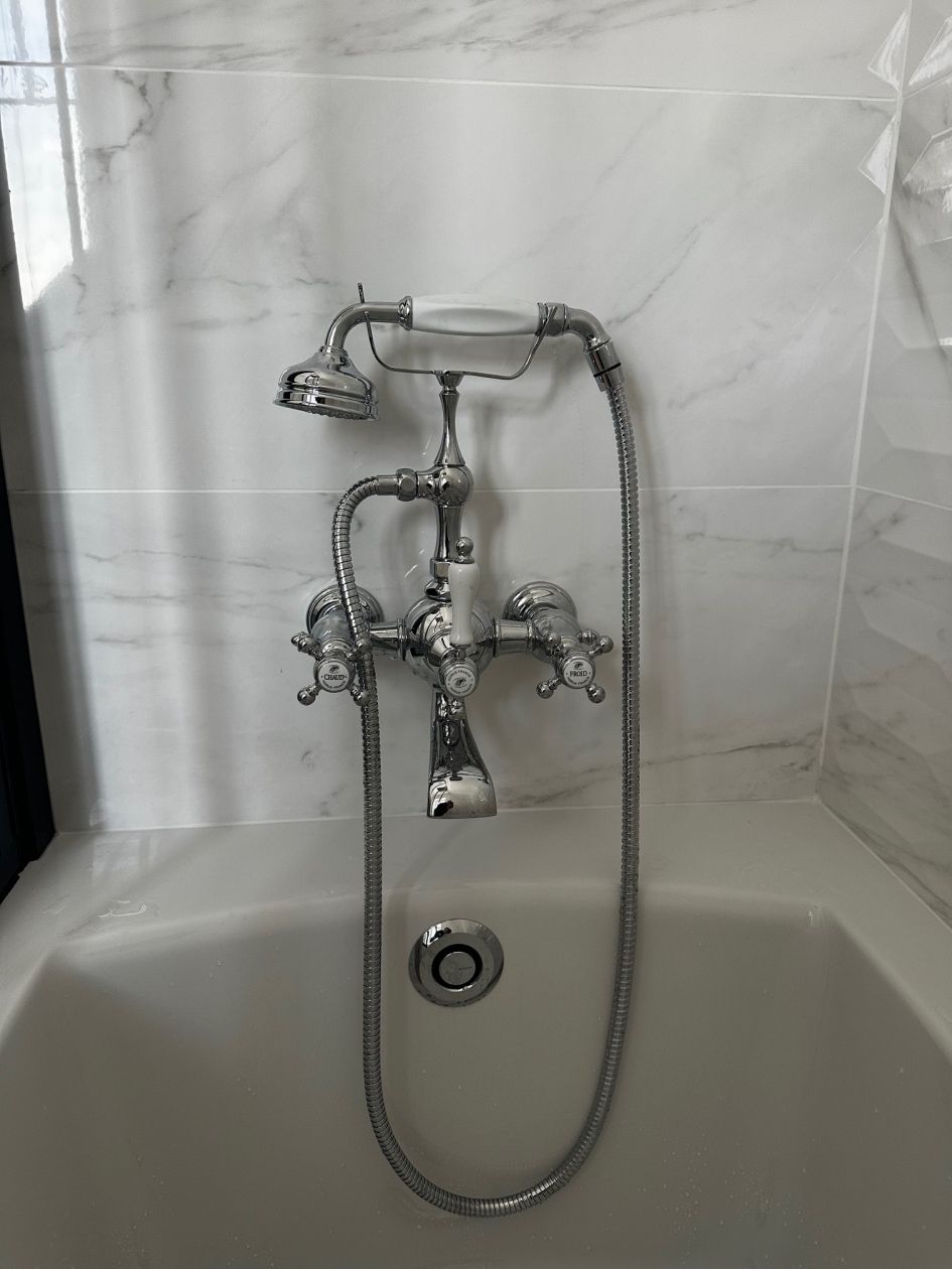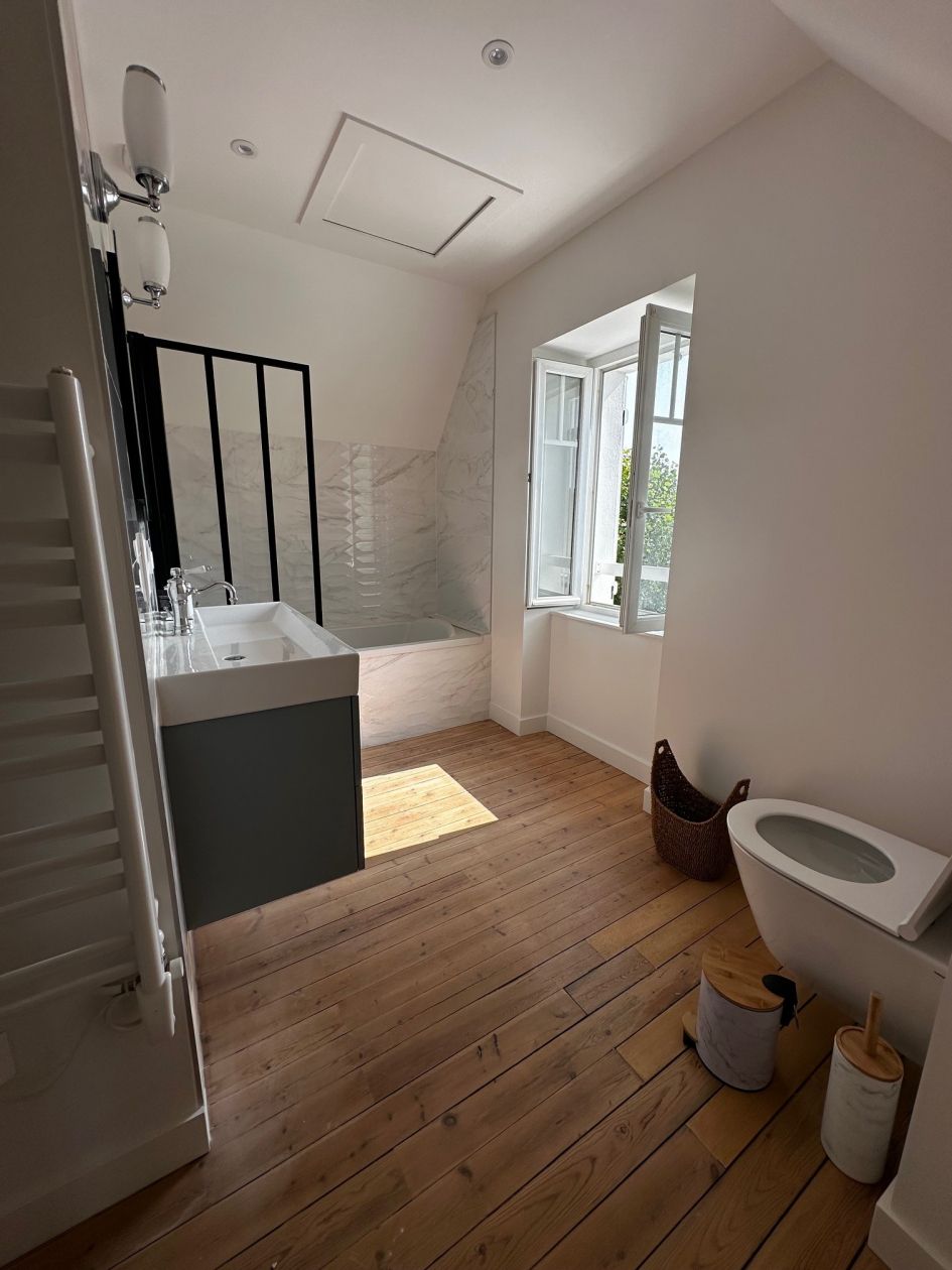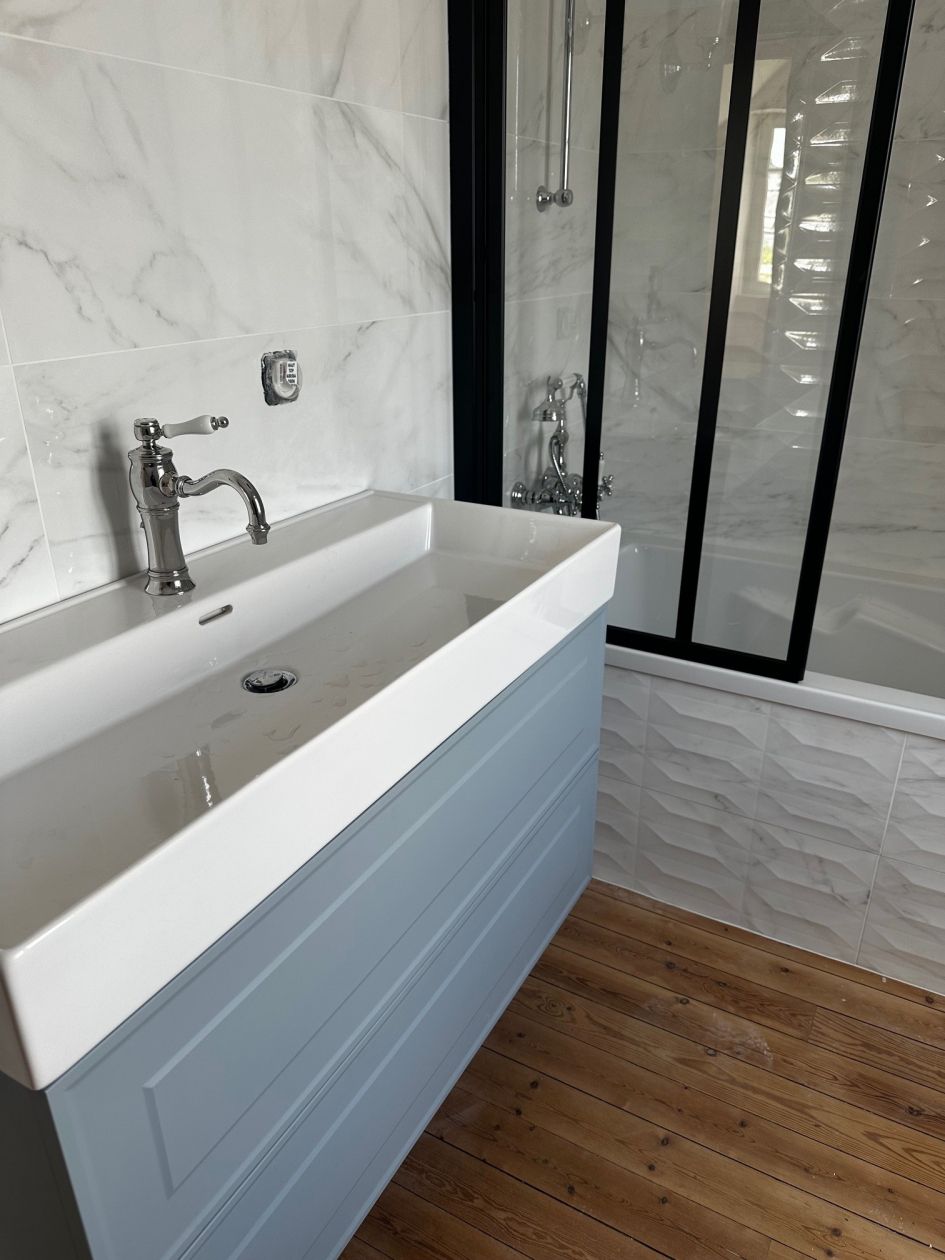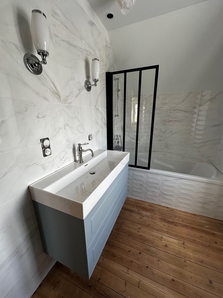 Création de deux salles de bain avec robinetterie et mobilier soigneusement sélectionnés pour leur esthétique et durabilité.