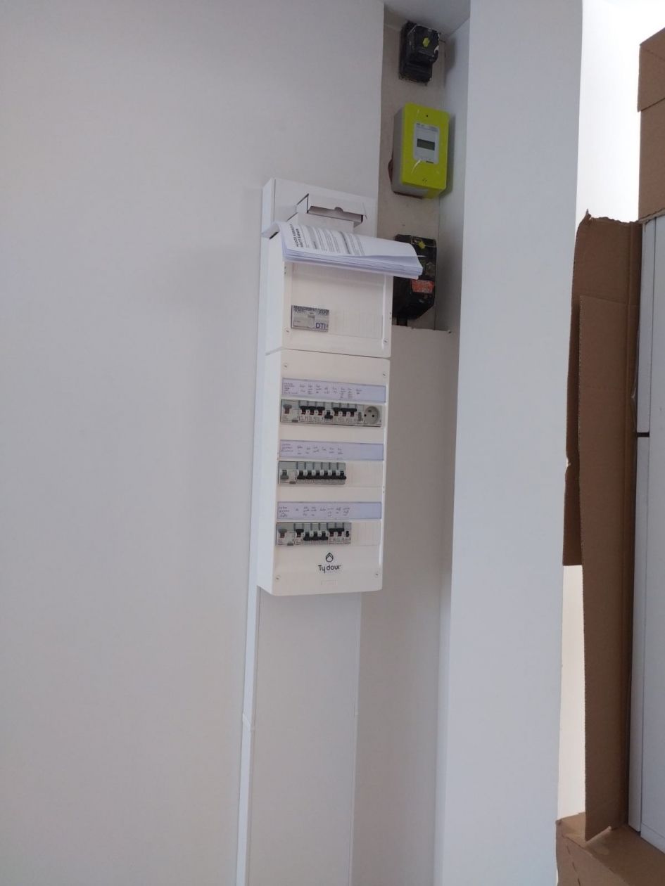 Refonte totale du réseau électrique et mise aux normes, incluant l'installation d'appareillages modernes et l'éclairage extérieur.