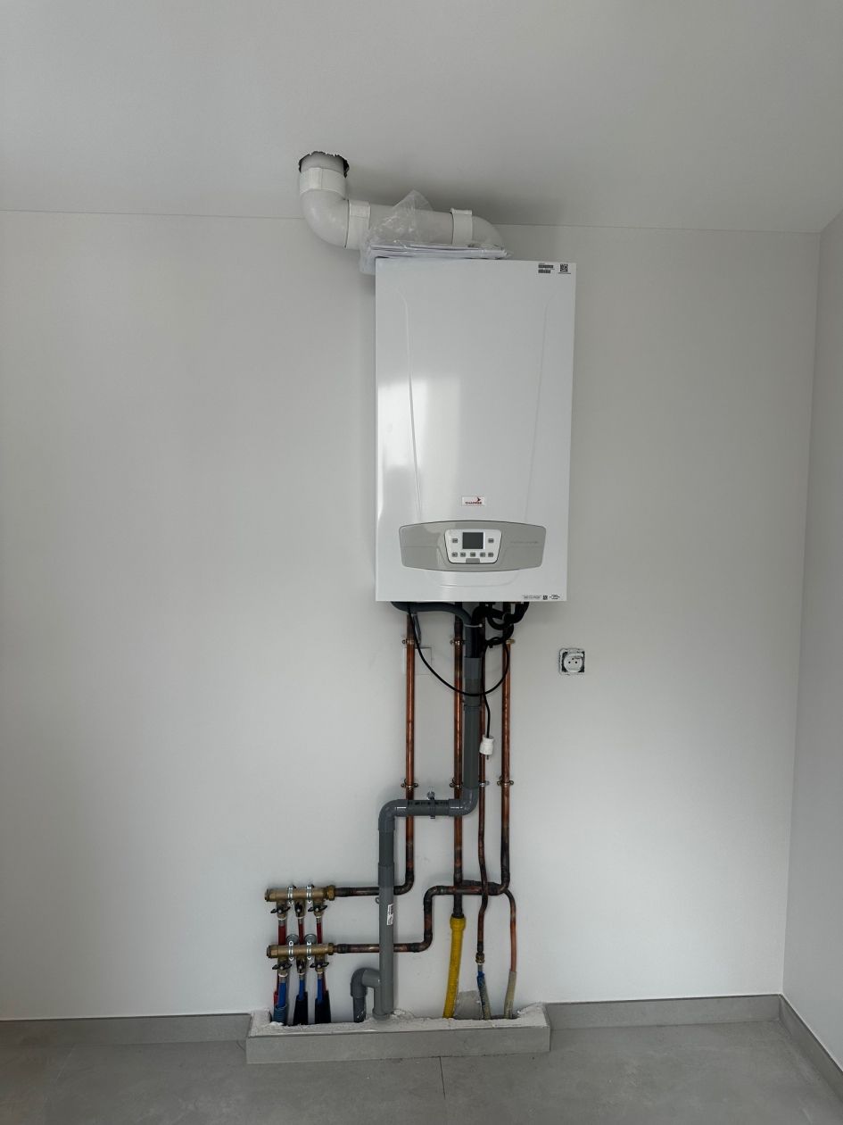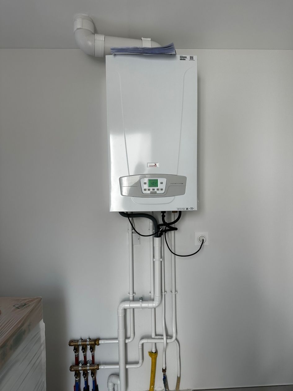 Pose d'une chaudière gaz à condensation performante associée à des radiateurs design pour une chaleur douce et homogène.