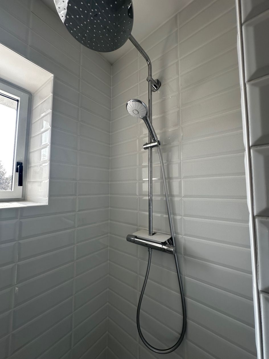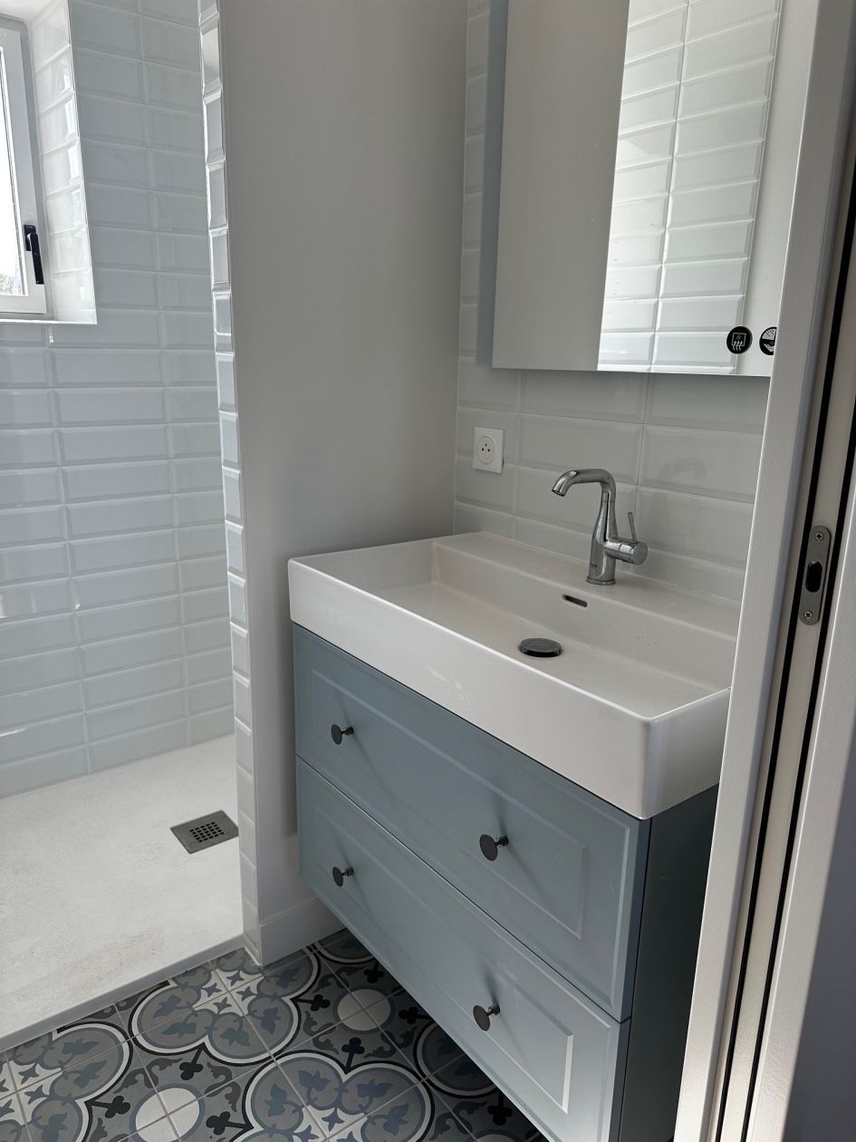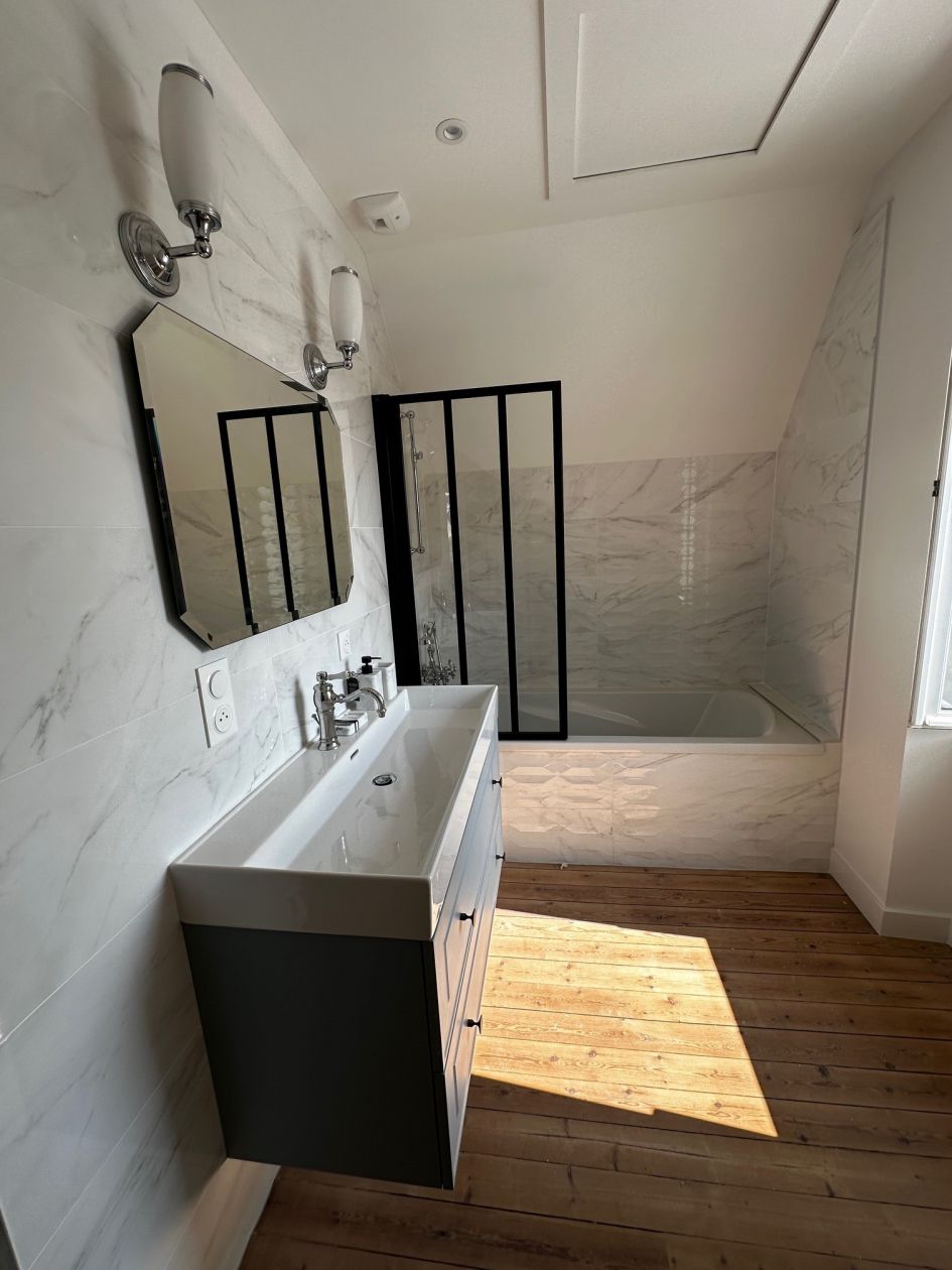 Les clients profitent désormais d'une maison entièrement modernisée, alliant le charme de l'ancien au confort contemporain. L'installation neuve de chauffage et d'isolation assure une performance énergétique optimale, tandis que les équipements sanitaires et l'éclairage apportent une touche design soignée à cette extension réussie.
